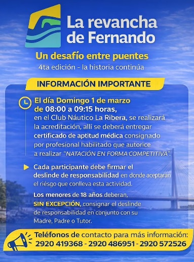 El Domingo 01 de Marzo 2026 desde las 08 hs. la cuarta edición de el Desafío entre Puentes, mientras el verano se despide, llega la 4ta edición de una carrera que ya es tradición, un desafío que pone a prueba tu resistencia, tu disciplina y tu pasión por las aguas abiertas, para contactos y mas información a los teléfonos 2920 419368 / 2920 486951 /2920 572526.-