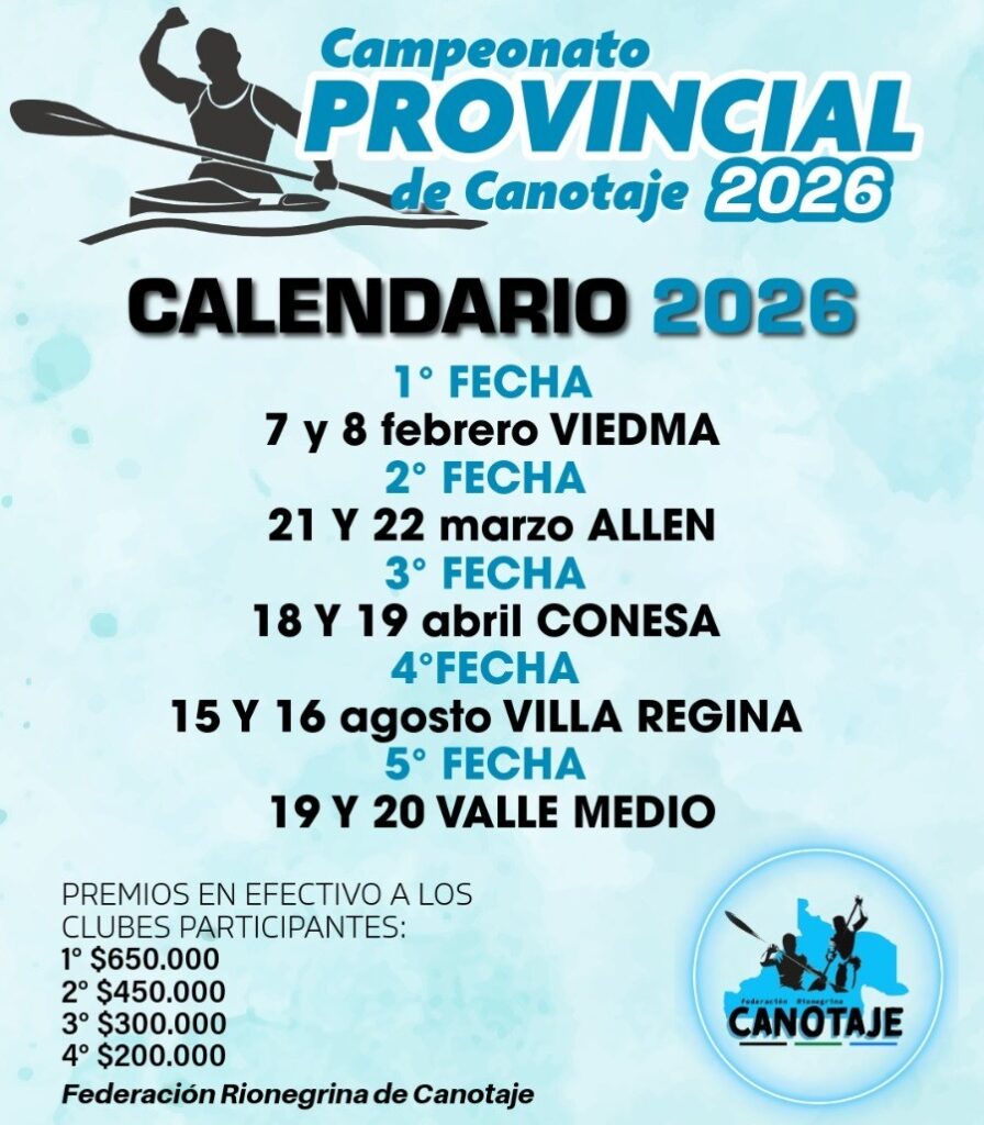 La Federación Rionegrina de Canotaje junto a la Asociación Civil Allen Rema, y la Secretaria de Deportes de Río Negro pondrán en disputa la 2ª fecha del Campeonato Provincial de Canotaje a realizarse en la ciudad de Allen los días 21 y 22 de marzo 2026 el campeonato, que ya disputo la primer fecha en Viedma los dias 07 y 08 de Febrero 2026, está abierto a escuelas, instituciones y clubes, comprende todas las categorías.