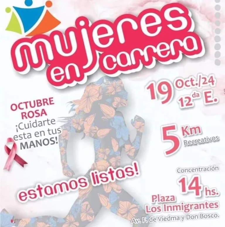 Organizada por el Departamento de Actividades Físicas y Recreativas de la Policía de Río Negro (D.A.F.y.R.) organiza una vez mas la denominada “Mujeres en Carrera” una corre caminata, “no competitiva” y donde se convoca a las mujeres a realizar un recorrido de 5 K que puede hacerse corriendo o caminando y esta reservada solo a Mujeres de todas las edades, este año con el objetivo de concientizar en este mes de lucha contra el cáncer de mama. El punto de concentración será como e costumbre la Plaza de los Inmigrantes en Av. Don Bosco y Francisco e Viedma, a las 14 hs. donde habrá una entrada en calor y un cierre de jornada con músicas y sorteos de regalos que aportaron las casas de comercio de Viedma y Patagones.-