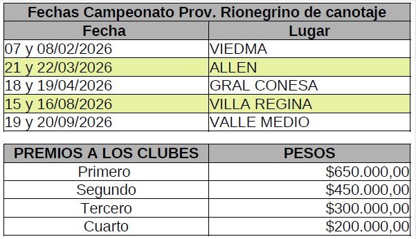 La Federación Rionegrina de Canotaje (F.R.N.C.) dio a conocer las fechas del campeonato provincial Rionegrino y este año con la novedad de los premios en efectivo para los primeros cuatro clubes, al finalizar el campeonato.-