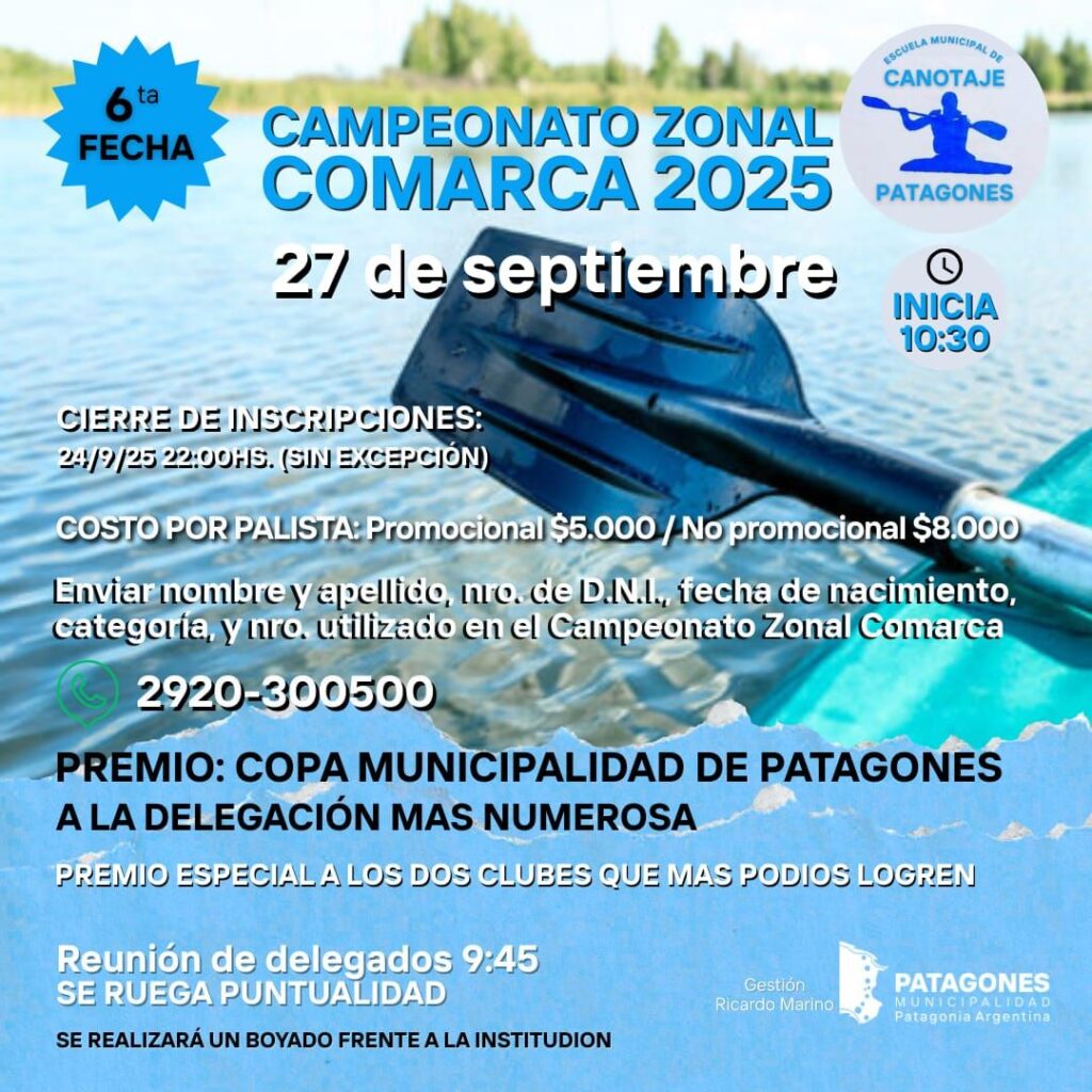 En esta oportunidad será la sexta en la Escuela Municipal de Carmen de Patagones, que en su propia sede en un circuito boyado frente a la institución en la costanera de Patagones quienes tomaran la organización, es importante recordar que el dia 24 de Septiembre se cierran las inscripciones sin excepción (por tema de seguro) las acciones comenzaran a las 10,30 de la mañana, la reunion de delegados esta programada a las 09,30 hs. para informes y consultas se debe llamar o enviar WhastApp +54 2920 30 05 00.-