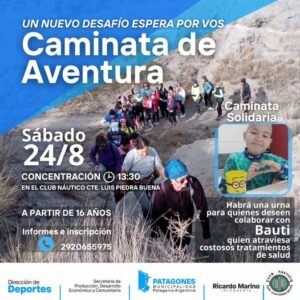 El sabado 24 de Agosto se realizara una nueva Caminata Aventura, y como de costumbre la concentración sera a las 13,30 hs. En instalaciones del Club Náutico Cte. Luís Piedra Buena de Patagones, la edad […]