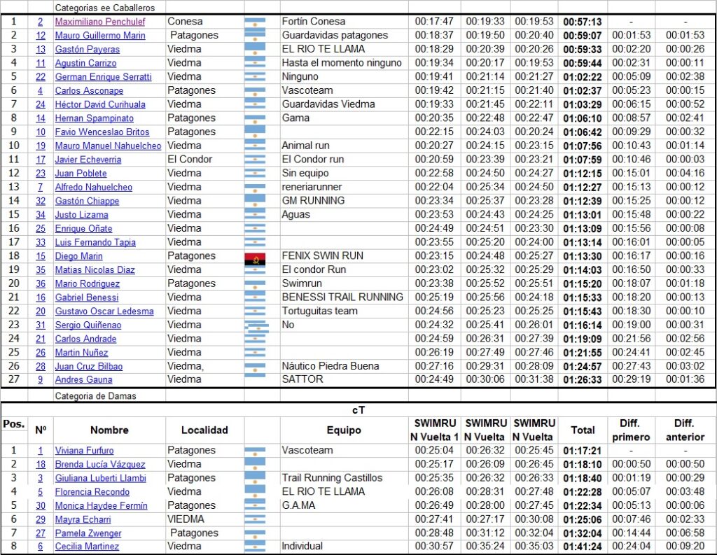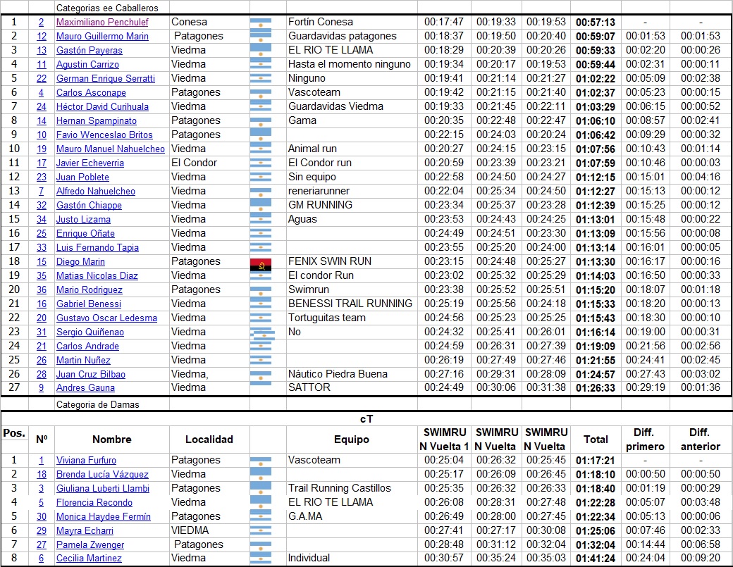 Por primera ves en la comarca se disputo una competencia de la especialidad “Swimrum” que consistió en correr Trail, nadar, volver a correr, volver a nadar y así tres veces a un recorrido que tenia 600 mtrs de natación y dos trail de dificultad 3 …Donde se puede usar manoplas de natación, traje de neopreno, “pullboy” (flotador para piernas) y lo que quieras para nadar… pero también hay que llevar cuando corres. hasta el final de la competencia, Obviamente la ropa que se usa para correr también la usas en la natación incluidas las zapatillas, en esta oportunidad solo e disputo en Cat, Damas y Caballeros unica.-