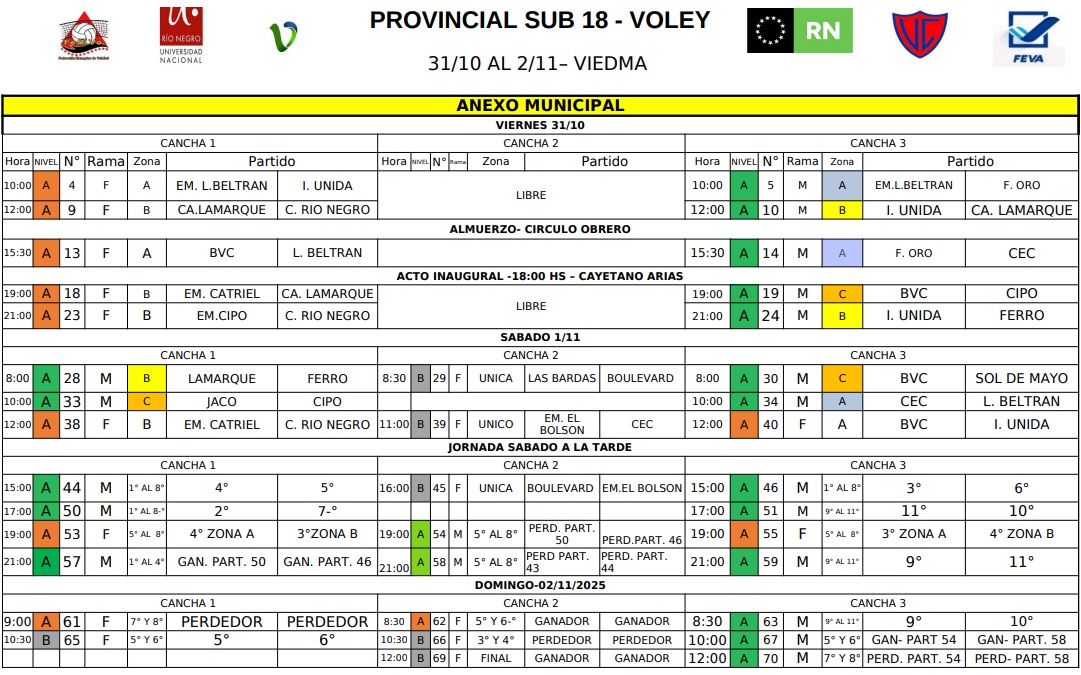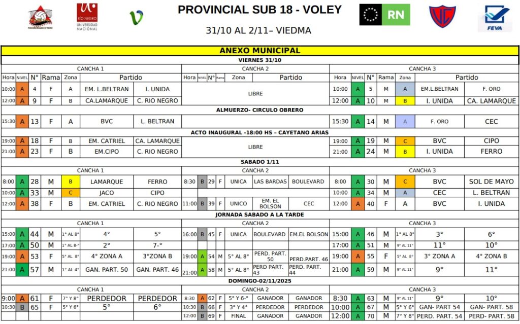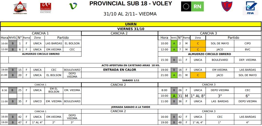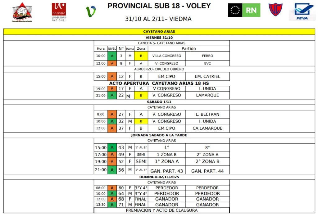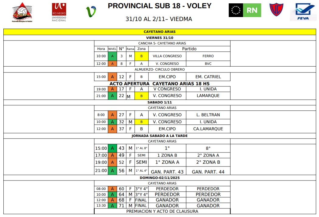 Con una cantidad importante Jóvenes Damas y Caballeros se desarrollo el acto inaugural del Provincial sub 18 de Voley que lleva adelante el Club Villa Congreso de Viedma, 14 equipos de Damas y 11 de caballeros provenientes de distintos puntos de la Provincia de Rio Negro, comenzaron Bailando y jugando al ritmo del Profesor Carlos Godoy, luego prosiguió el acto protocolar, con la entonación de los Himnos Nacional y de Río Negro, palabras de las autoridades presente y desconcentración, cabe recordar que el evento se extenderá hasta el domingo 02 de Noviembre y los partidos de disputaran en el “anexo” tres canchas eme ñ Polideportivo Ángel Cayetano “palito” Arias y en el Gimnasio de la U.N.R.N.