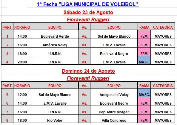 El fin de semana, el sábado 23 y el domingo 24 de Agosto, comienza al segundo torneo del año, Organizada por la Subsecretaria de Deportes de la Municipalidad de Viedma, ambos dias se jugaran en el Gimnasio Fioravanti Ruggieri de calle A. Barros 1400, el sábado desde las 14 hs. con tres juegos de la categoría Damas y uno de caballeros, mientras que el domingo serán también cuatro partidos, comenzando a las 12 hs. con un partido de caballeros y tres juegos de Damas, cabe recordar que la categoría esta reservada a mayores en ambas ramas la entrada es libre y gratuita con servicio de cantina, para disputar esta segunda parte de la Liga Municipal de Voley se insirvieron, 8 equipos en Caballeros que disputaran el torneo en dos zonas mientras que en Damas serán 13 los conjuntos que también disputaran dos zonas, desde la organización agradecieron la confianza y la participación de los clubes y referentes de la actividad para dar su apoyo a la actividad.-