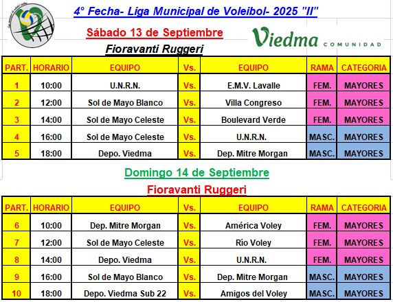 Con 10 partidos a jugarse durante el fin de semana del 13 y 14 de Septiembre 2025, se completara la cuarta fecha de la Liga Municipal de voley, el sábado 13 serán tres juegos de damas y dos de caballeros que comenzaran a disputarse desde las 10 de la mañana y cada dos horas continuar la grilla programada, mientras que el domingo 14 se repetirá el esquema y los horarios, con otros enfrentamientos, cabe recordar que la entrada es libre y gratuita con atención de cantina.-