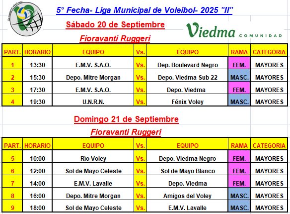 Durante el fin de semana se disputara la quinta fecha de la Liga Municipal de Voley, que lleva adelante la Subsecretaria de Deportes de la Municipalidad de Viedma, la misma se concretara durante el día sábado 20 de Septiembre con cuatro juegos a desarrollarse el Gimnasio Fioravati Ruggieri, desde as 13 hs. en adelante, contando en este día con la participación de la Escuela Municipal de Voley se San Antonio Oeste en la categoría Damas, mientras el domingo, 21 continuara la fecha en el mismo gimnasio con cinco juegos que comenzaran a partir de las 10 de la mañana, la entrada es libre y gratuita y se cunenta con servicio de cantina-(foto archivo)