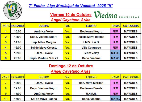 La Subsecretaria de Deportes de la Municipalidad de Viedma dio a conocer el cronograma de partidos de la séptima fecha, que comenzara el Viernes 10 de Octubre de 2025 en virtud del feriado las acciones se trasladaran al Gimnasio Polideportivo Ángel Cayetano “palito” Arias con cuatro juegos que darán comienzo a las 10 hs. y serán protagonizados por la categoría damas para finalizar con dos juegos de Caballeros, el sábado no habrá actividad, mientras que el domingo se reanudara en el mismo estadio también desde las 10hs. con tres partidos de damas y cerrara un juego de caballeros en ambas jornada la entrada es libre y gratuita y habrá sercicio de cantina.-
