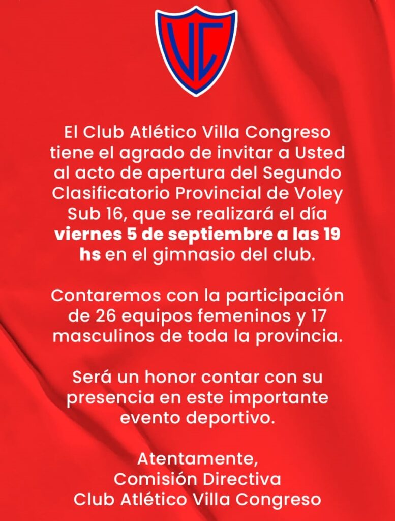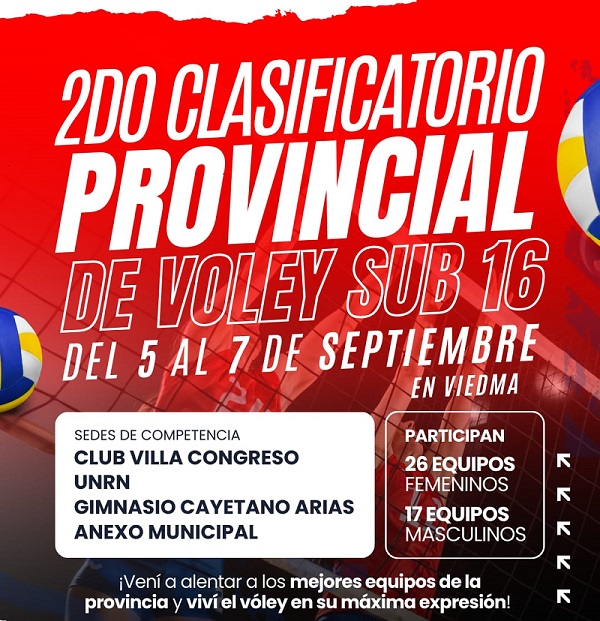 Desde el Viernes 05 al 07 de Septiembre 2025, con la Organización del Club Villa Congreso de Viedma se realizara el 2do, Clasificatorio Provincial de Voley recebado para Damas y Caballeros en la categoría Sub 16.-